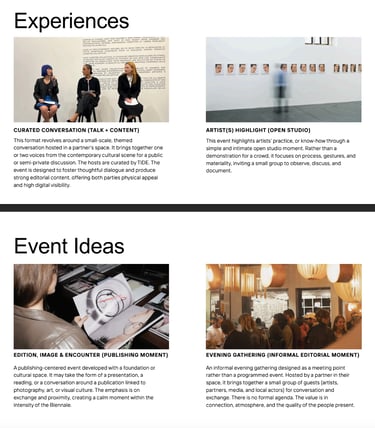 TIDE est un média culturel indépendant bilingue (FR/EN), dédié aux scènes artistiques émergentes, aux récits visuels contemporains. Il propose une revue papier et une plateforme numérique. Son lectorat est principalement composé de jeunes professionnels de la création visuelle, artistes, graphistes, photographes, ainsi que de passionnés d’art et de design.