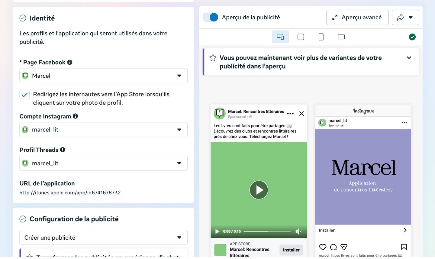Pilotage de campagnes META notoriété et promotion app générant plus de 168k impressions et touchant 87k personnes uniques, assurant une visibilité large et qualifiée.